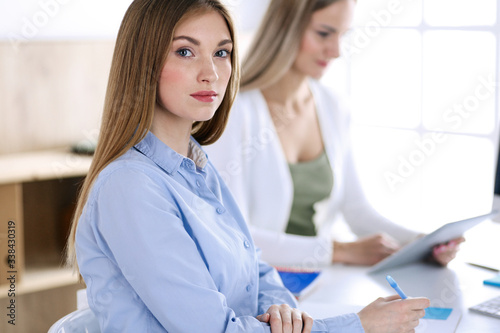 Business woman headshot. Businesspeople or colleagues discussing something at meeting while sitting at the desk in office. Casual clothes style. Audit, tax or lawyer concept