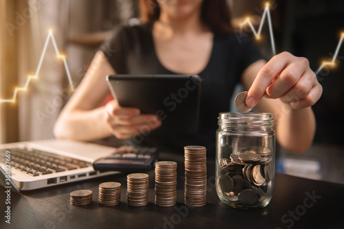 Business woman holding coins putting in glass with using calculator to calculate concept saving money for finance accounting.