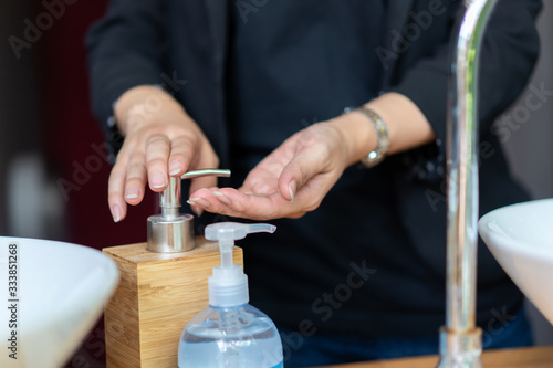Business woman in dark black suit is puhsing washing soap on her hand beside the sink.