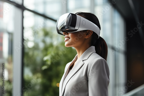 Business woman in formal suit using vr device goggle virtual reality ai experience planing and stretegy process work plan in office