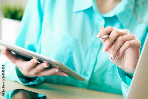Business woman looking and studying statistics on tablet display closeup. Female left hand holds pen, right holds tablet.