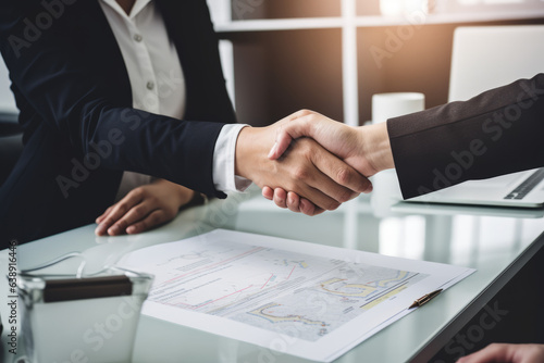 business woman manager handshaking at office meeting. hr hiring recruit at job interview, bank or insurance agent, lawyer making contract deal with client at work. Generative AI