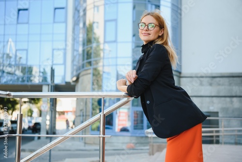 business woman on the street is looking at a document. Scrolls a folder near the building.