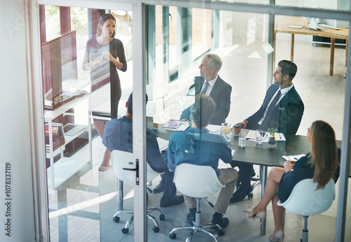 Business woman, pregnant and presentation for workshop, strategy and review from above in office. Team, corporate and development proposal for project update, planning or financial report with screen