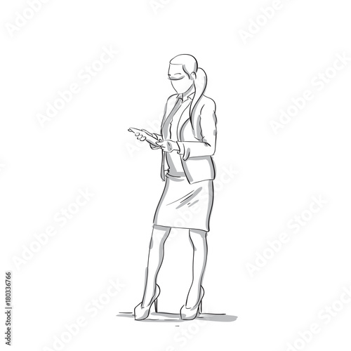 Business Woman Reading Documents Sketch Silhouette Of Businesswoman Full Length On White Background Vector Illustration