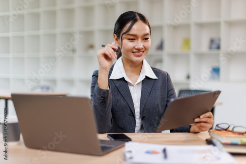 Business woman signs an electronic document on a digital document on a virtual tablet laptop computer screen,Paperless workplace idea, e-signing, electronic signature, document management.