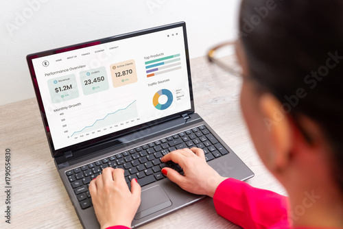 Business woman typing on laptop with analytics dashboard showing revenue, charts, and traffic sources, concept of digital marketing and financial growth