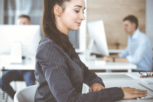 Business woman using computer at workplace in modern office. Brunette secretary or female lawyer looking at the camera and happy smiling. Working for pleasure and success
