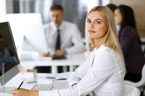 Business woman using computer at workplace in modern office. Secretary or female lawyer smiling and looks happy. Working for pleasure and success