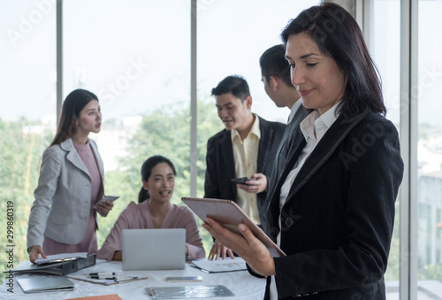 Business woman using computer tablet on background of business peoples in conference room,Group of business professional meeting.
