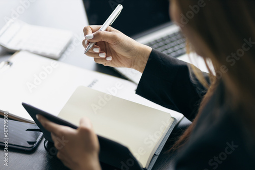 Business woman working in an office writes financial and accounting records. Accountant is working in a bank office.