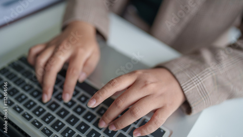 business woman working with laptop Hands typing keyboard. Professional investor working new start up project. business planning in office. Technology business.