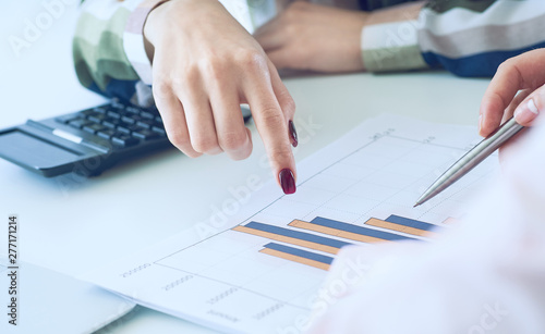 Business women discussing the charts and graphs showing the results of their successful teamwork. Just hands over the table.
