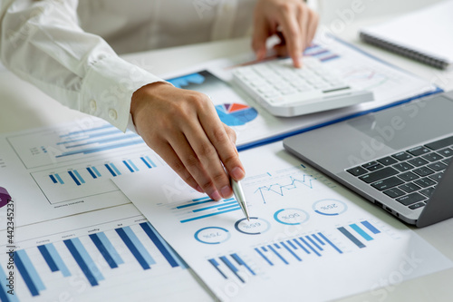 Business women working at charts, spreadsheets, graph financial development, bank accounts, statistics, economy, data analysis, investment analysis, stock exchange concept.