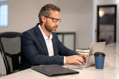 Business worker with laptop at office. Employee remote working in modern office. Business man on online meeting. Hispanic business man working online. Mature business man using laptop at workplace.