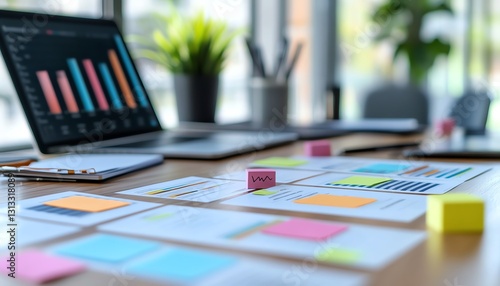 Business workspace with laptop and charts