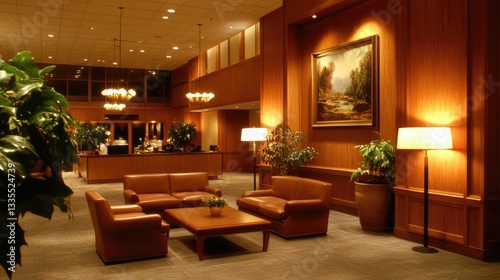 Business-focused hotel lobby with a professional seating area, ambient lighting, and modern decor.