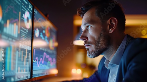 Businessman analyst reviewing predictive analytics data on a virtual screen in a working room during the evening with soft artificial lighting, close-up shot