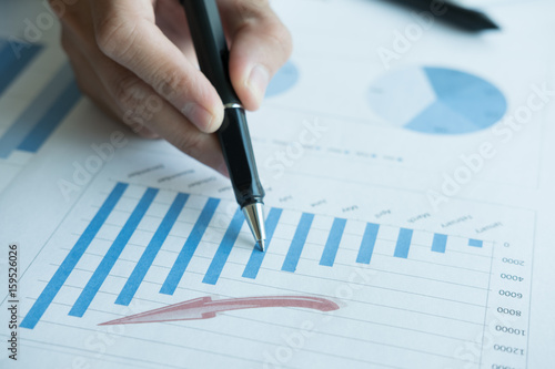 businessman analyze market chart at workplace. young male entrepreneur woman working with business document at office. analytic financial accounting graph plan report.
