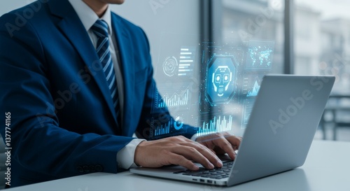 Businessman analyzing AI-driven data on laptop, visualizing futuristic technologies