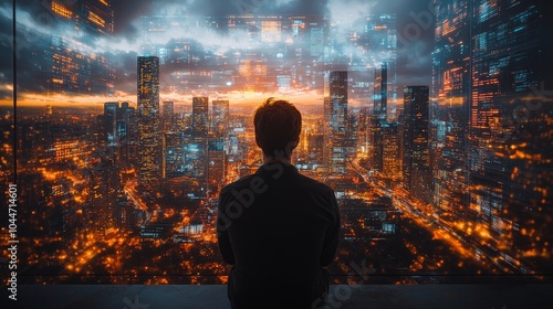 Businessman Analyzing Data on Digital Screens with City Skyline Background