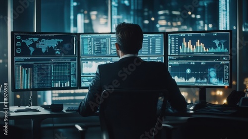 Businessman Analyzing Data on Multiple Monitors