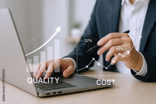 Businessman Analyzing Financial Charts and Graphs on Laptop in Modern Office Setting.