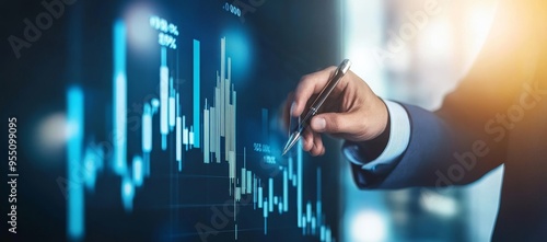 Businessman analyzing financial data and sale reports on touch screen to achieve business goals. Business analysis, finance, and investment concept.