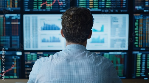 Businessman Analyzing Financial Data in Modern Office Environment Digital Graphics and Stock Market Insights
