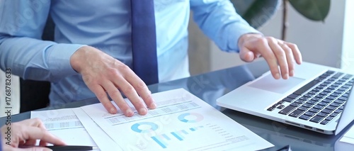 Businessman analyzing financial data on laptop and calculator. Close-up of a professional auditor working on financial reports. Business concept