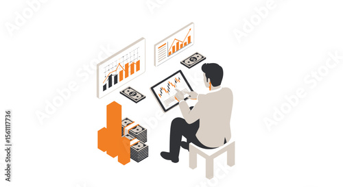 Businessman Analyzing Financial Data on Tablet with Charts and Cash.