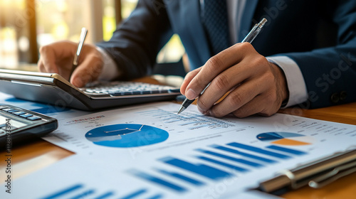Businessman Analyzing Financial Data with Calculator, Writing Notes, and Reviewing Graphs in Modern Office Setting During Daylight Hours