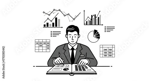 Businessman Analyzing Financial Data with Charts Graphs and Tables in Monochrome.