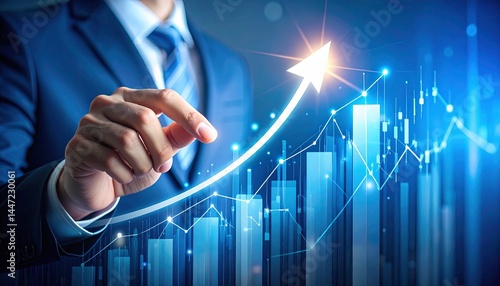 Businessman analyzing financial growth chart with upward arrow indicator data visualization