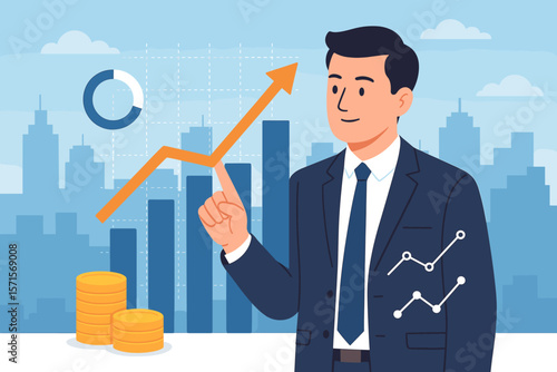 Businessman Analyzing Financial Growth, Investment Data, and Business Strategy with Upward Graph, City Skyline, Coins, and Analytics Chart