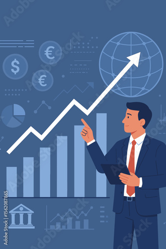 Businessman analyzing financial investment strategy for economic growth. Manager pointing at stock market chart and data analytics dashboard with global currency exchange rates.