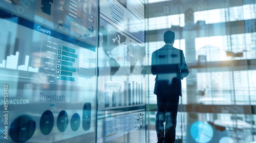 Businessman analyzing global data on digital screens in modern corporate office, reflecting technology and finance trends.