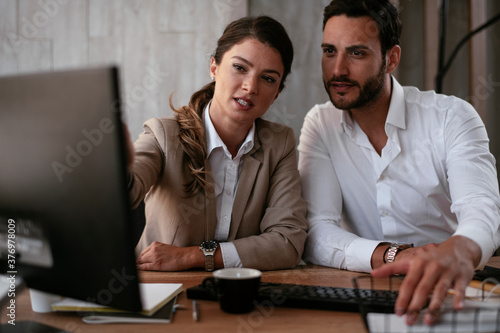 Businessman and businesswoman in office. Businesswoman and businessman working on the project