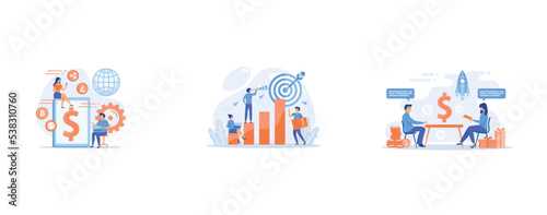Businessman and woman transfer money with gadgets, Businessman on top looking into telescope and employees, Salesperson trying to persuade customer in buying product, set flat vector modern illustrati