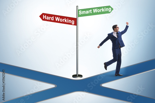 Businessman at the crossroads on working smart or hard