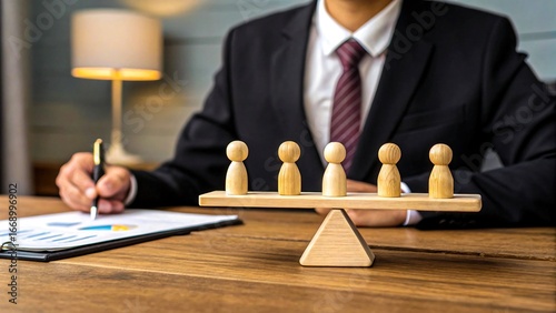 Businessman balancing wooden figures on seesaw scale for teamwork concept