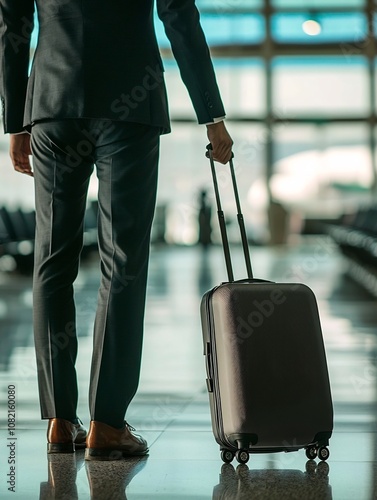 Businessman Carrying Suitcase at International Airport Departure Gate Awaiting Global Business Trip