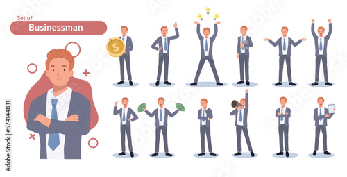 Businessman character set. Different poses and emotions. Flat Vector illustration