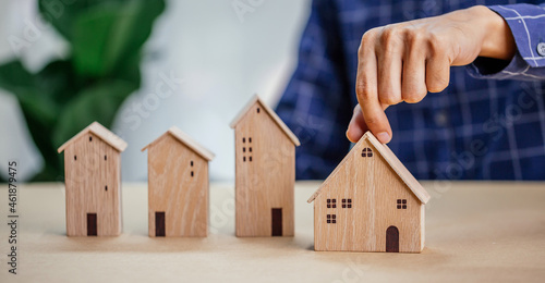 Businessman choosing mini wood house model from model and row of coin money on wood table, selective focus, Planning to buy property. Choose what's the best.