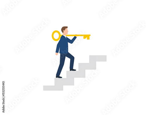 Businessman climbing stairs carrying a golden key towards success