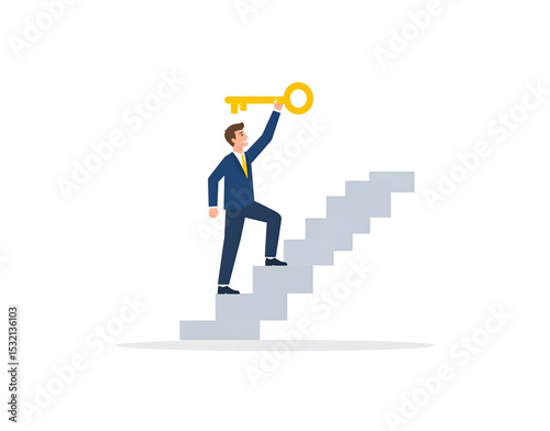 Businessman Climbing Stairs Holding Golden Key Upward for Success (1)