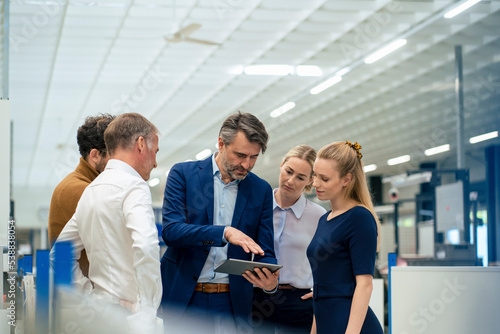 Businessman discussing over tablet computer with colleagues at warehouse