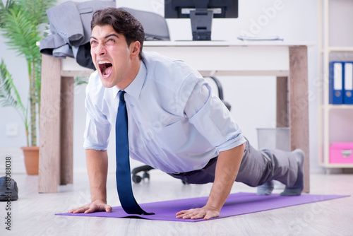 Businessman doing sports in office during break