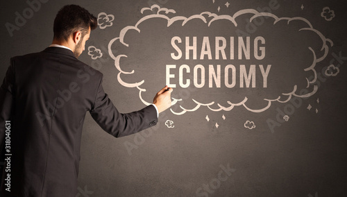 businessman drawing a cloud with SHARING ECONOMY inscription inside, modern business concept