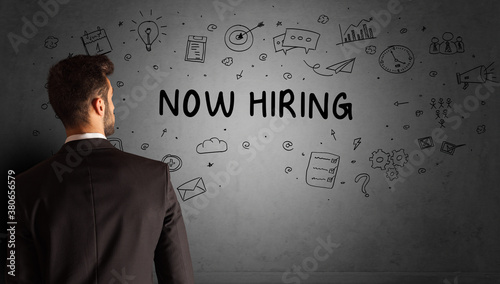 businessman drawing a creative idea sketch with NOW HIRING inscription, business strategy concept